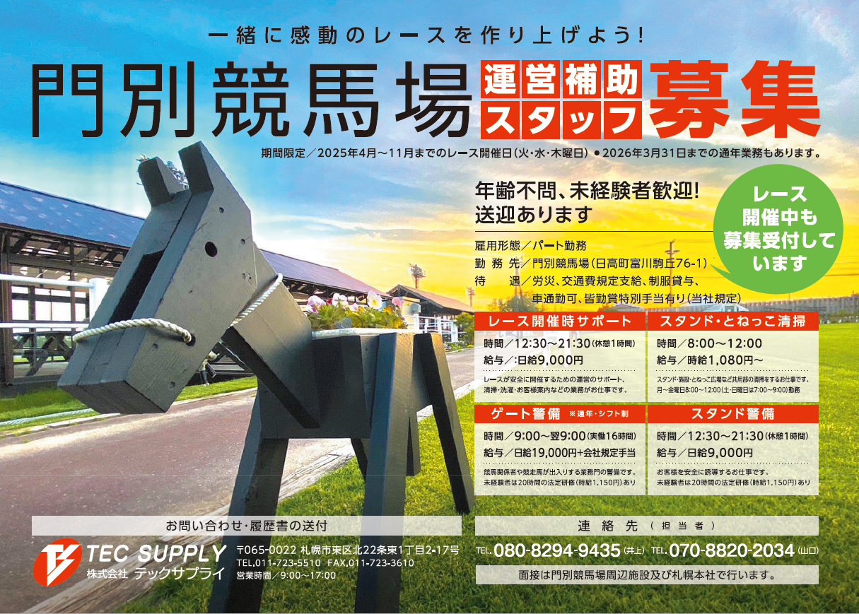 テックサプライでは、門別競馬場の運営補助スタッフを大募集中です。