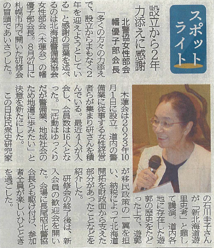 2025年9月8日付北海道建設新聞に、当社代表の幡が部会長を務める北海道警備業協会女性部会(木蓮会)の活動を掲載していただきました。